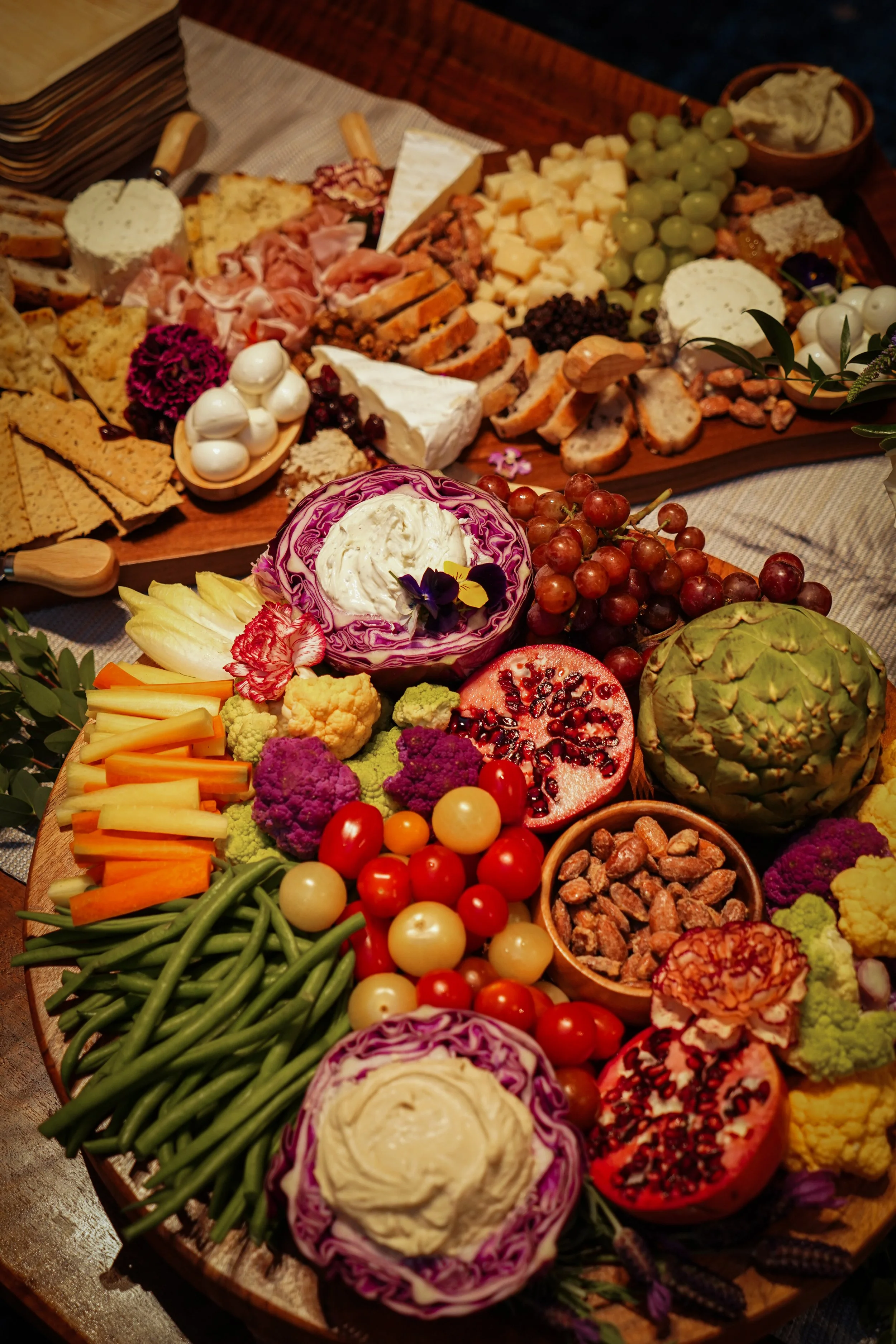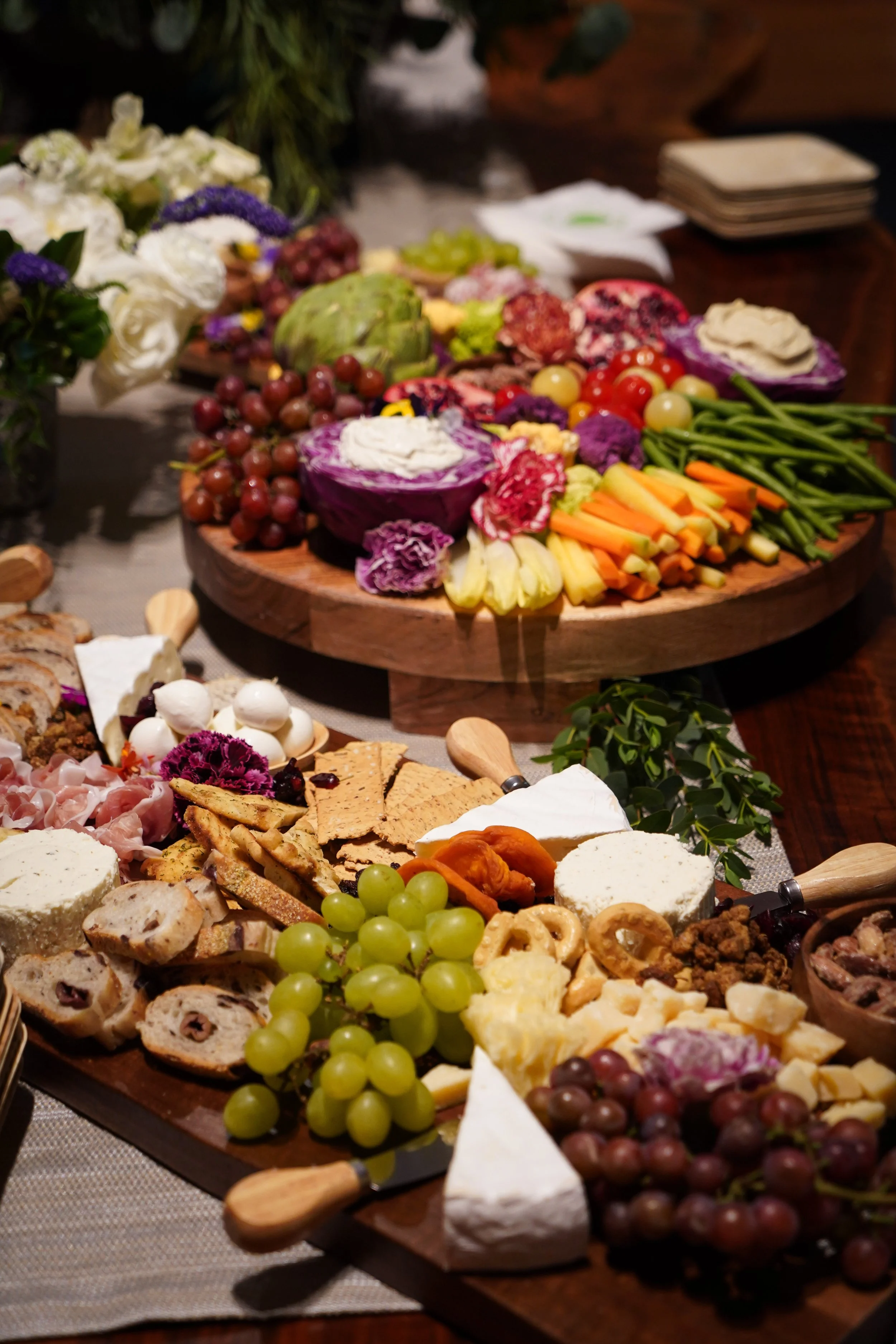 Boards can also be created with sweets—featuring chocolates, cookies, fruit, and miniature desserts—or with fresh crudité and mezze for a lighter, seasonal twist. Whether savory, sweet, or a mix of both, every board is customized to suit your event.